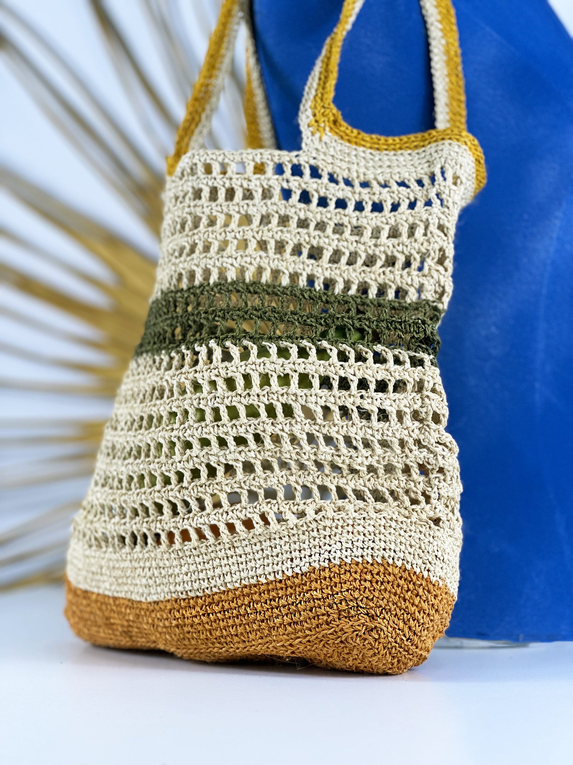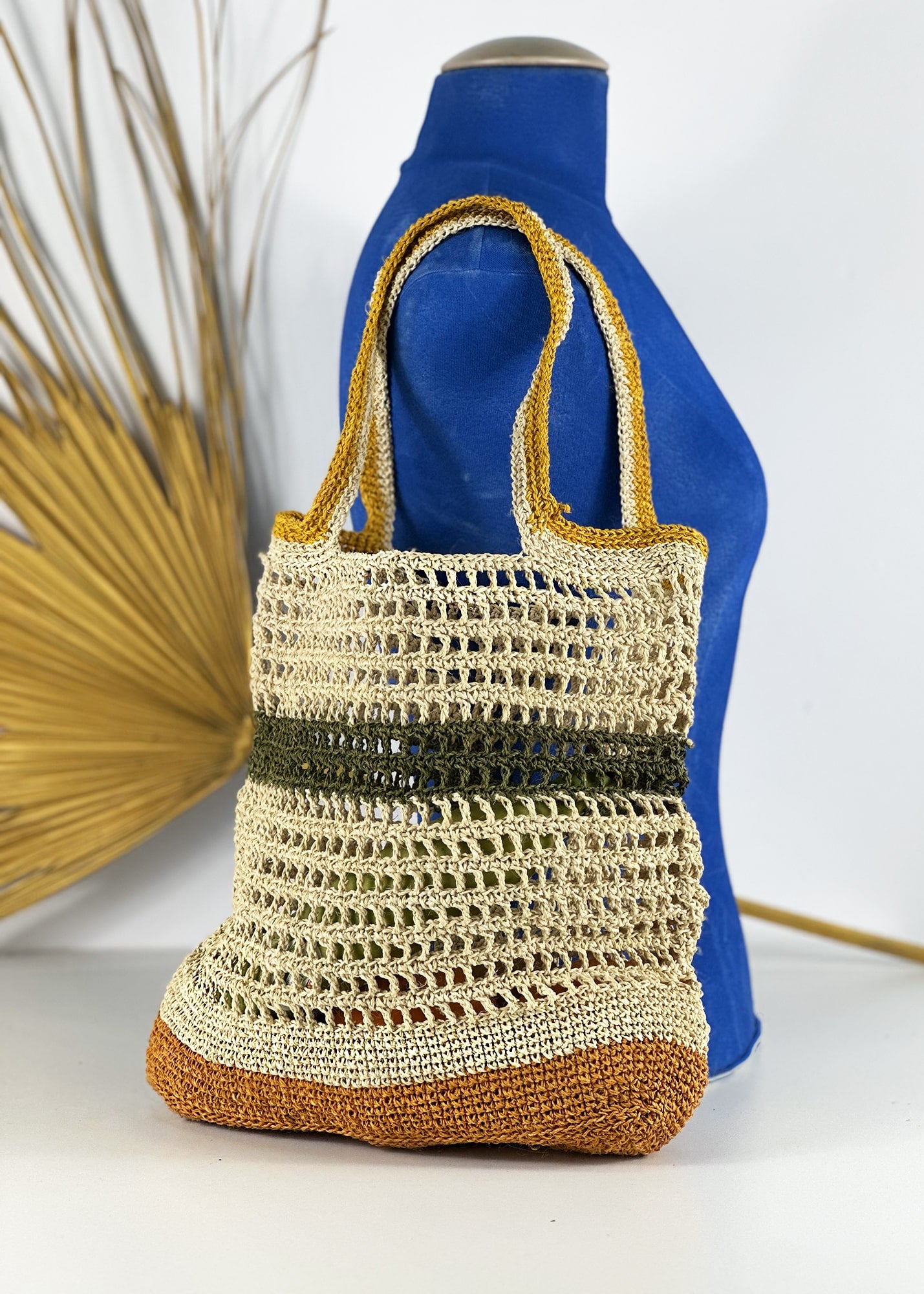Este bolso cuadrado está confeccionado con chambira, en color natural, verde y ambar. Medidas 32 x 30 x 7 cm. Las asas tienen una longitud de 43 cm. Cierre ajustable con adornos de semillas de wayruro en los cordones.