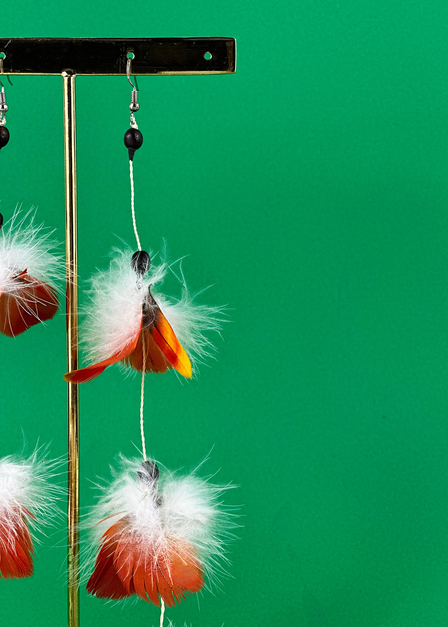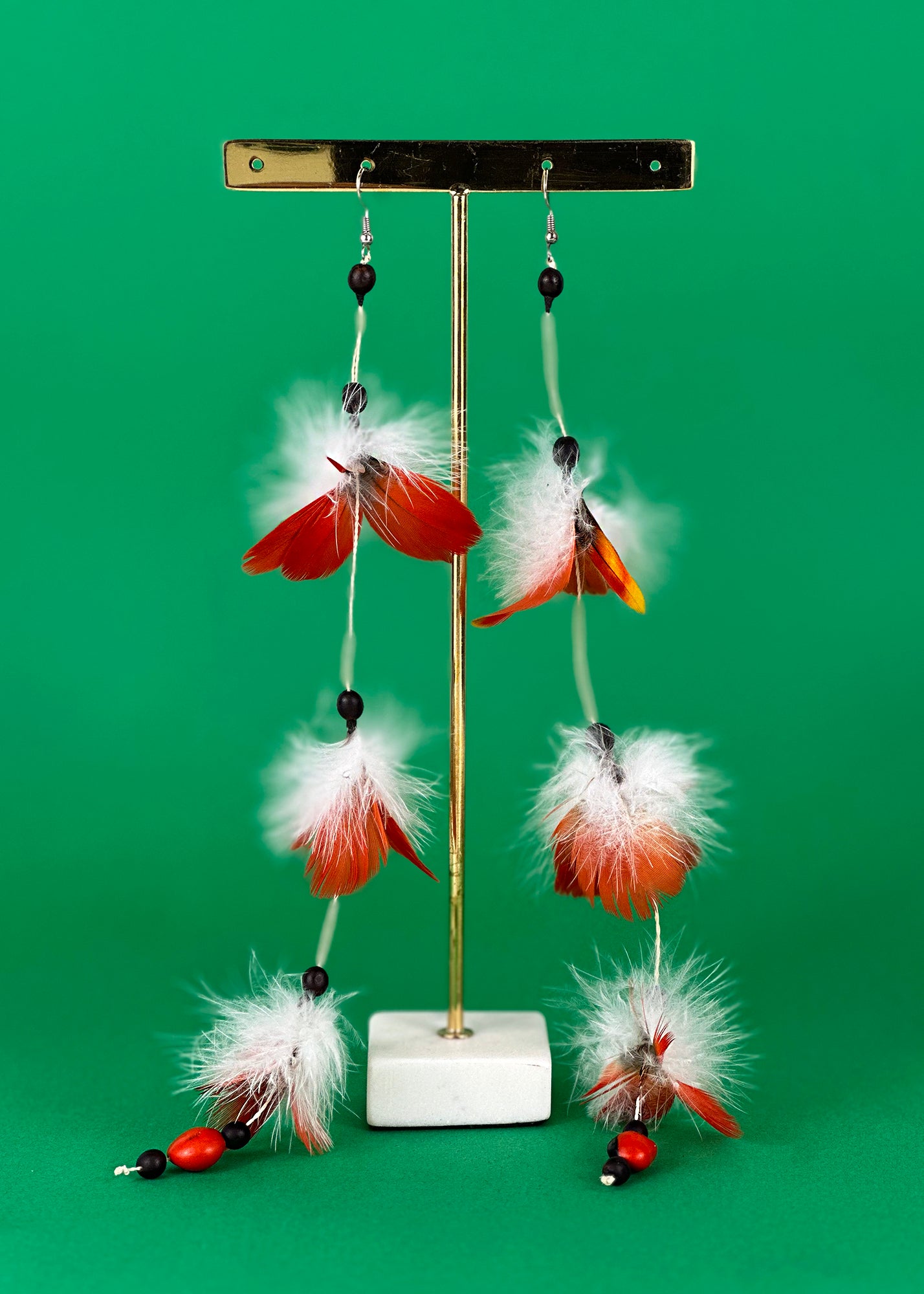 Esta pieza está creada por las compañeras artesanas waoraní del Parque Nacional Yasuní en la provincia de Orellana, Ecuador. Forma parte de la colaboración con Galería Viajera Sensorial Interactiva. Se trata de un adorno ligero y colorido de elegancia natural que combina plumas con chambira y algunas semillas decorativas. Enganches en plata.