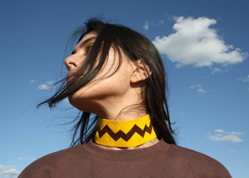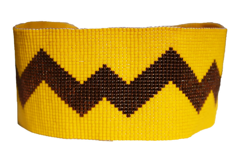 Diseñado por SUR y tejido en Saraguro, en la comunidad de Ñamarín, creado con las prestigiosas perlas japonesas Miyuki. Cierre de plata bañado en oro.